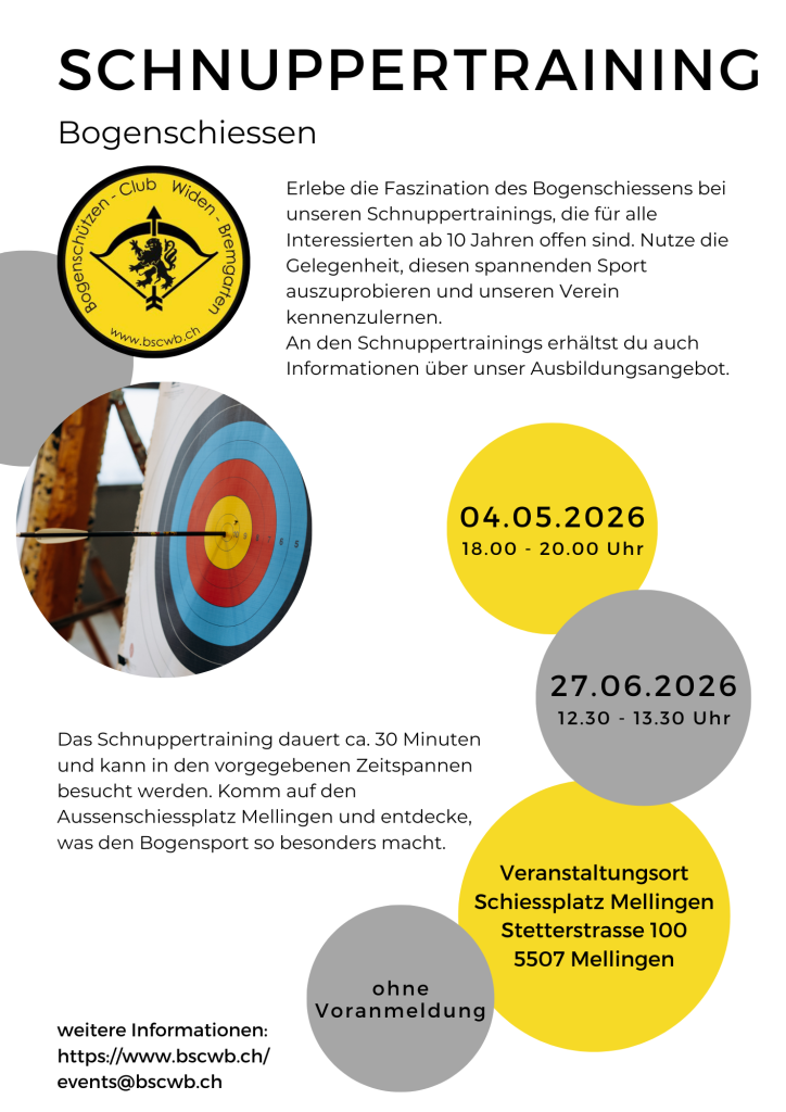 Erleben Sie die Faszination des Bogenschiessens bei unseren Schnuppertrainings, die für alle Interessierten ab 10 Jahren offen sind. Nutzen Sie die Gelegenheit, diesen spannenden Sport auszuprobieren und unseren Verein kennenzulernen. Hier erhalten Sie auch Informationen über unser Ausbildungsangebot.